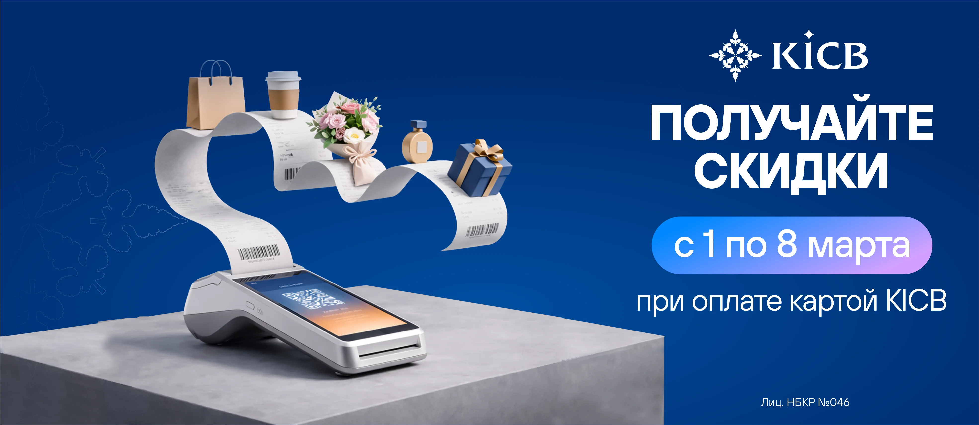 С 01 по 08 марта 2026 года оплачивайте покупки и услуги картами KICB в партнерских торговых точках и получайте скидки до 25% от суммы покупки.