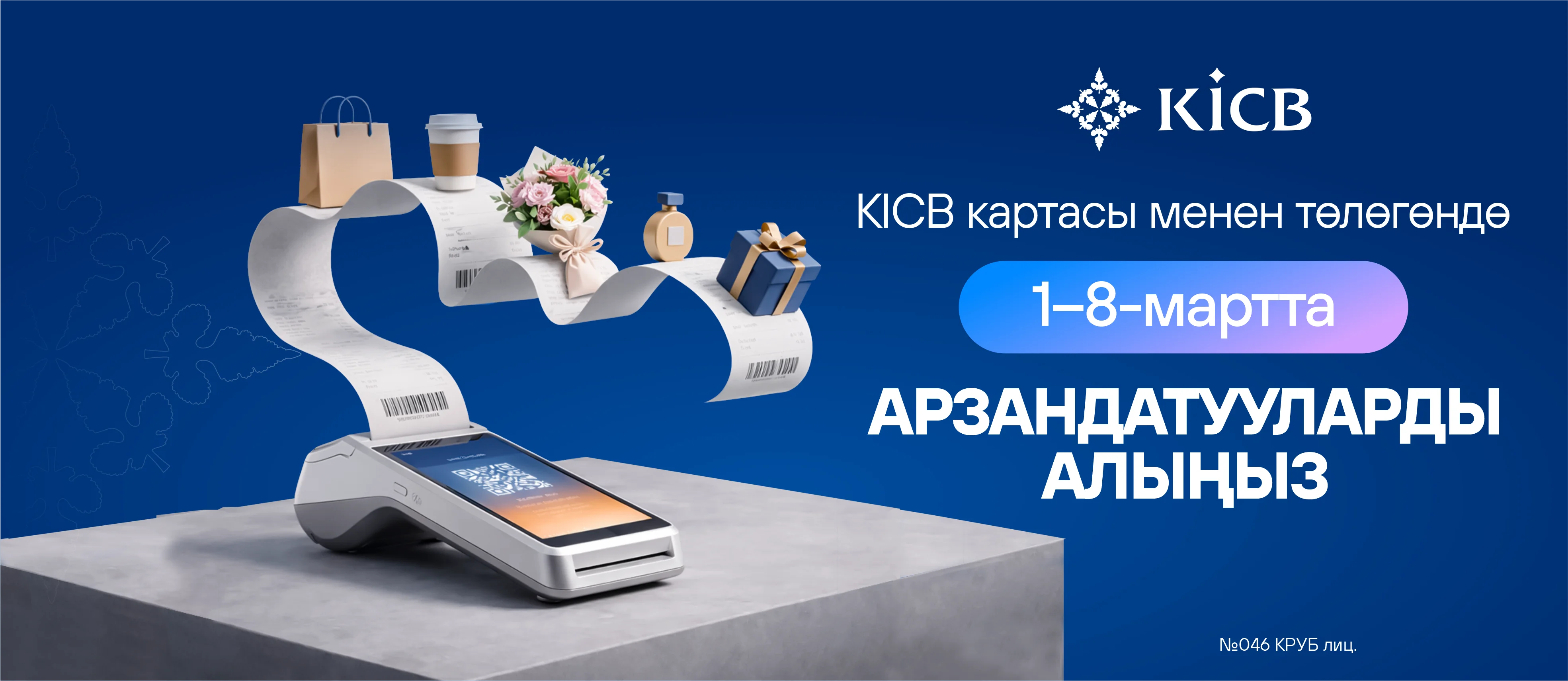 2026-жылдын 1-мартынан 8-мартына чейин KICB карталары менен өнөктөш соода түйүндөрүндө төлөм жүргүзүп, сатып алуу суммасынан 25% га чейин арзандатууларды алыңыз.