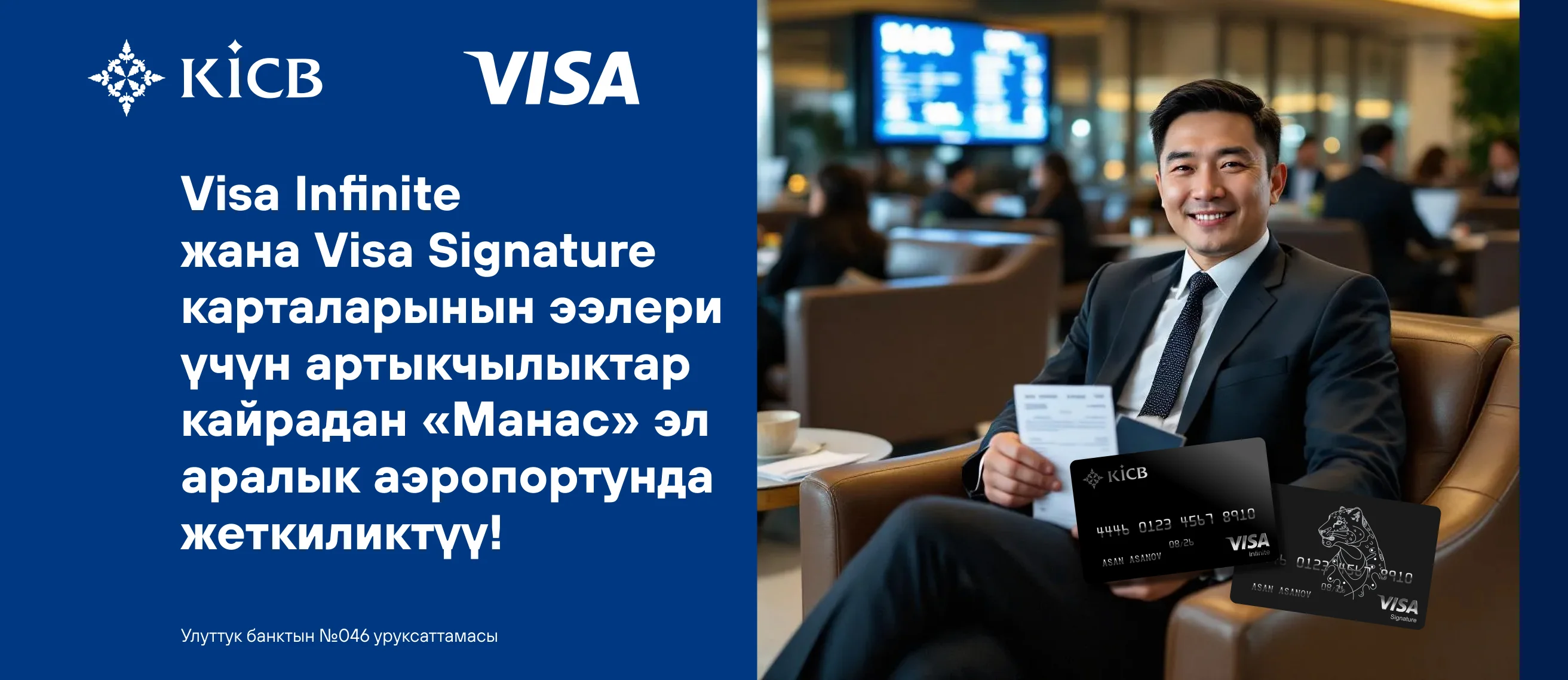 2025-жылдын 13-октябрынан тартып «Манас» эл аралык аэропортунда Visa Infinite жана Visa Signature премиалдык карталарынын ээлери үчүн артыкчылыктар кайрадан ишке кирет!
